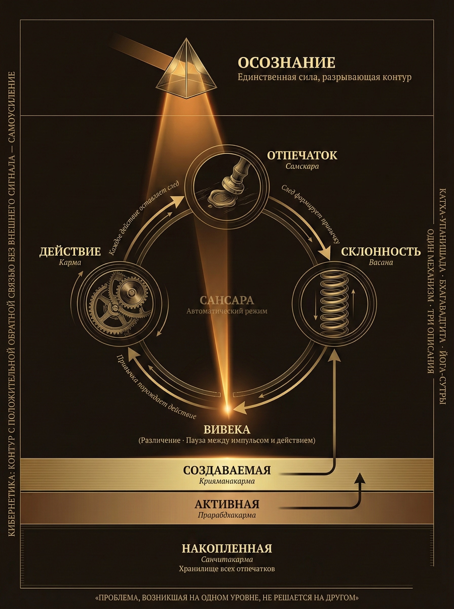 Механизм не через вмешательство внешней силы, а через внутреннюю структуру. Каждое действие создаёт самскару. Самскара — активная тенденция, стремящаяся к проявлению. Тенденция притягивает соответствующие обстоятельства. Человек с сильной васаной гнева будет снова и снова оказываться в ситуациях, провоцирующих гнев. Не потому что «вселенная наказывает», а потому что его внутренняя структура резонирует с определёнными частотами реальности.
