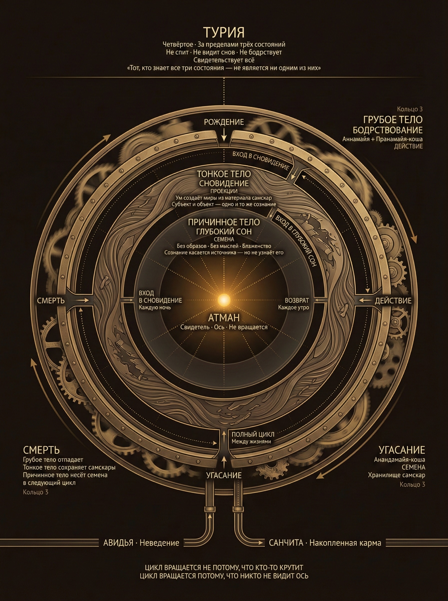 На ментальном — ассимиляция мудрости: не память о событиях, а извлечение сути. Всё, чему научила жизнь, кристаллизуется в качества Психического Существа. Затем — причинное тело, состояние покоя, пока не созреет следующая прарабдха.