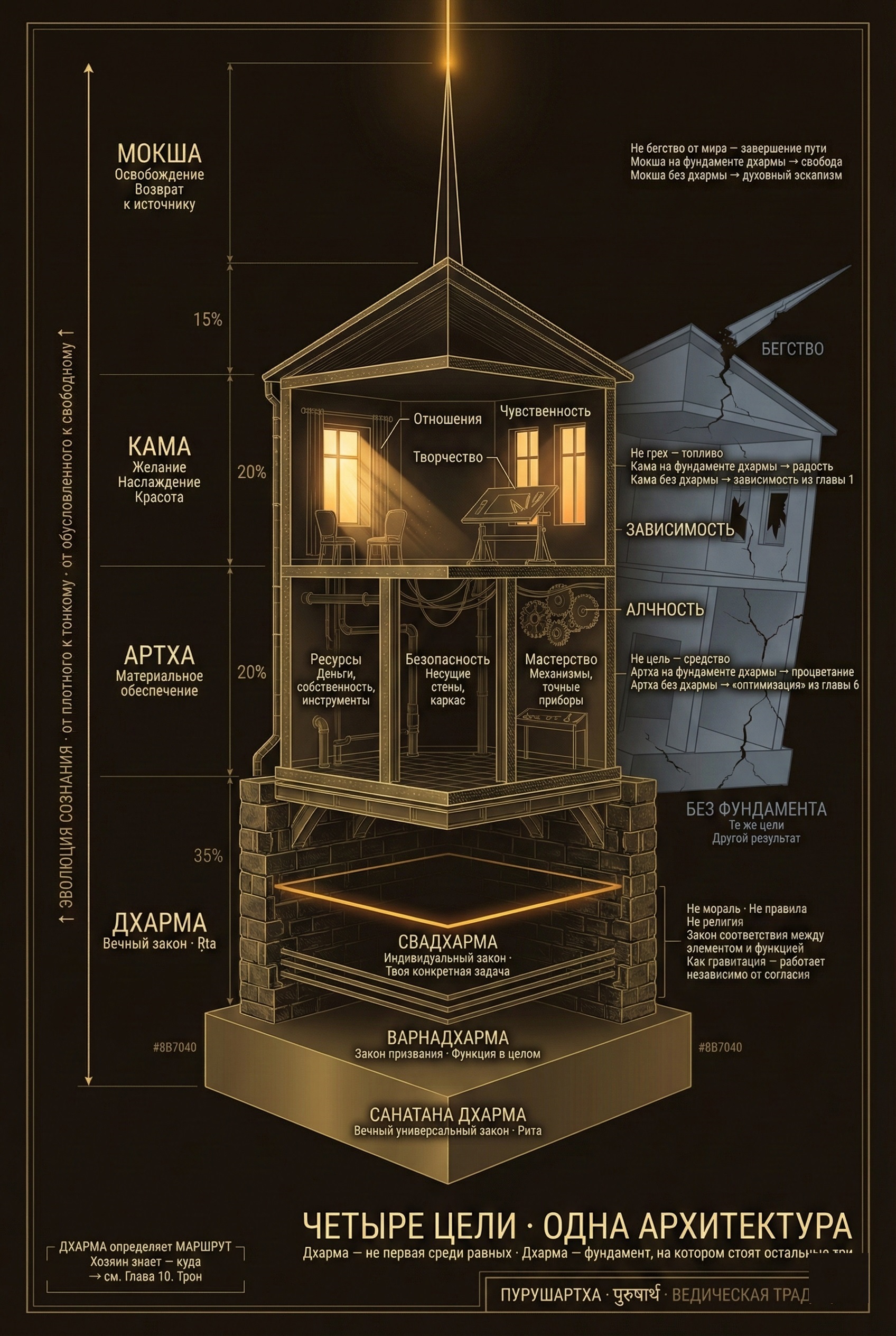 Весь «культ успешного успеха» — это артха без дхармы. Весь гедонизм потребления — кама без мокши. Здание без фундамента и без крыши. Диагноз первой части книги — одним предложением.