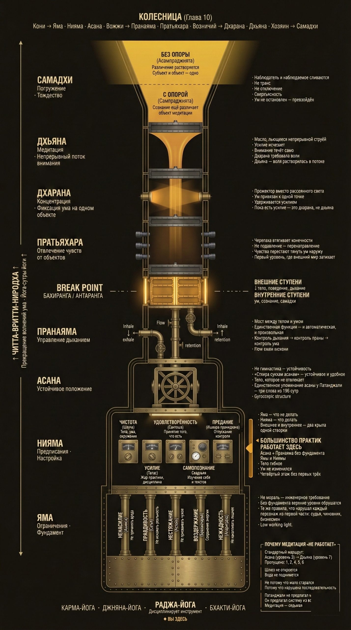 Одно наблюдение, стоящее целого трактата: когда тело чистое и эмоции под контролем — ум легко контролировать; когда приходят сильные эмоции — намного сложнее, можно потерять контроль полностью. Тело, эмоции и ум — не три отдельных системы, а одна; нижний уровень определяет верхний. Именно поэтому Патанджали ставит тело и дыхание перед концентрацией. Фундамент — перед стенами.